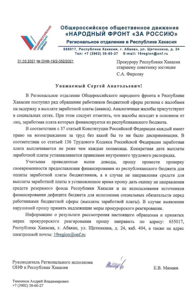 Задержка зарплаты уже давно превысила разрешенный законом предел, поэтому хакасское региональное отделение Общероссийского народного фронта (ОНФ) направило на имя Прокурора Хакасии Сергея Фирсова обращение с просьбой провести проверку своевременности выплат заработной платы бюджетникам, которых финансирует региональная казна.