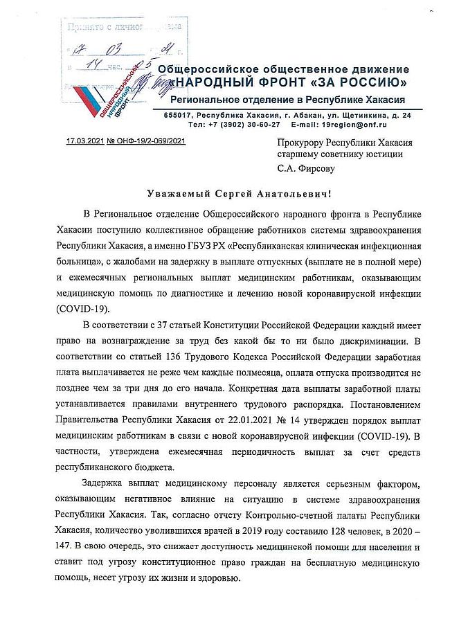 Поэтому Общероссийский народный фронт на основании данных о задержке выплат медикам подал официальное обращение в прокуратуру, в котором просит проверить действия (бездействие) чиновников Хакасии на наличие халатности.