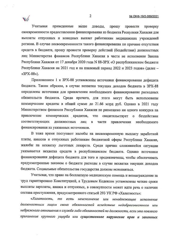 Однако, как отмечается в заявлении ОНФ, «в 2021 году Минфином Хакасии не размещено ни одного конкурса на привлечение кредитов, что свидетельствует о бездействии соответствующих должностях лиц в части привлечения необходимого финансирования».
