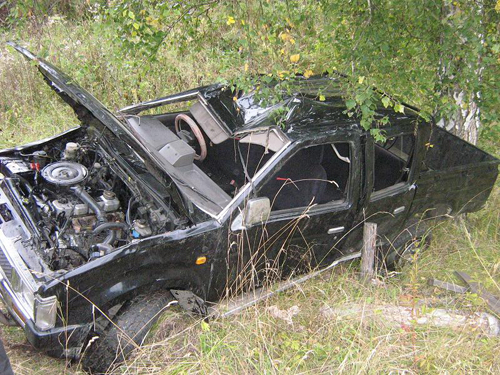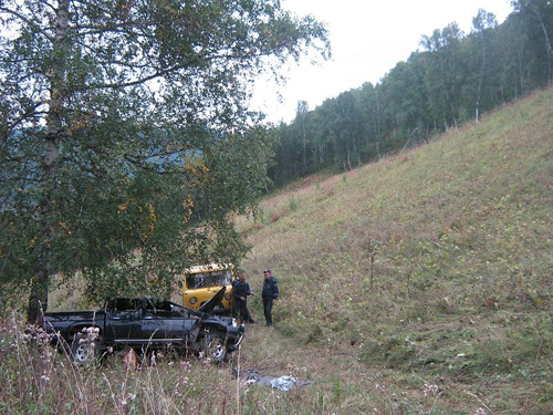 В Саяногорске (Хакасия) наряд ДПС получил информацию о том, что недалеко от поселка Майна, в урочище «Березовый лог», произошло дорожно-транспортное происшествие. Добраться до места аварии на патрульном автомобиле по урочищу инспекторы не сумели. Оставив автомобиль, милиционеры продолжили путь пешком и, выйдя на открытое пространство, увидели искореженный джип, уткнувшийся в березу под горой (крутизну склона специалисты позже оценили в 60 градусов).