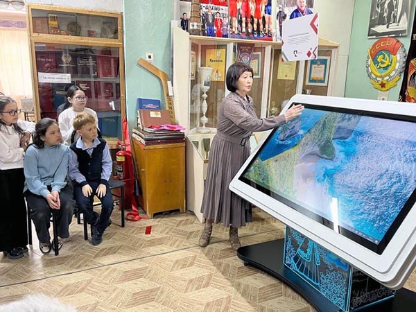 Школьники читают статью об основателе сорского музея Виленине Андрияшеве - его биографию теперь можно изучить не только на обычной табличке или стенде, но и через мультимедийную панель. Это как большой планшет, в котором есть масса информации о Хакасии и родном Сорске. В эпоху смартфонов воспринимать информацию с экрана, особенно если он больше метра по диагонали, ребятишкам проще.
