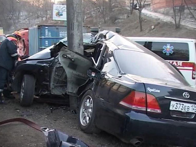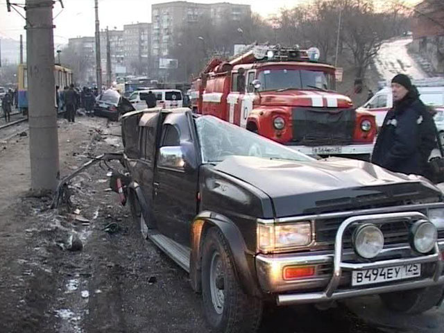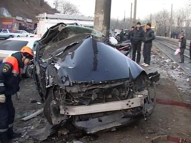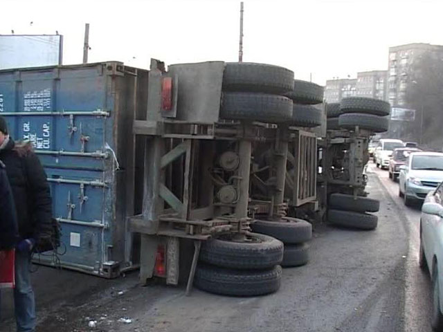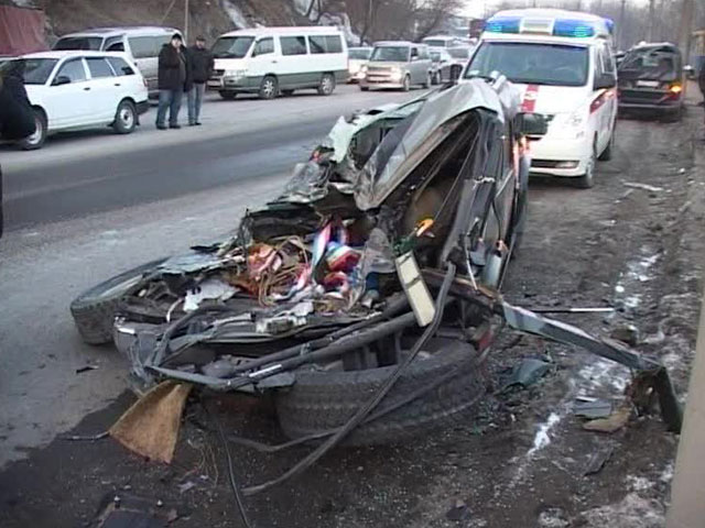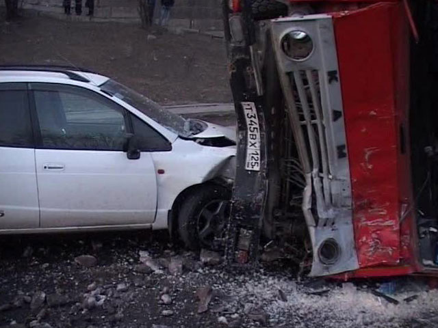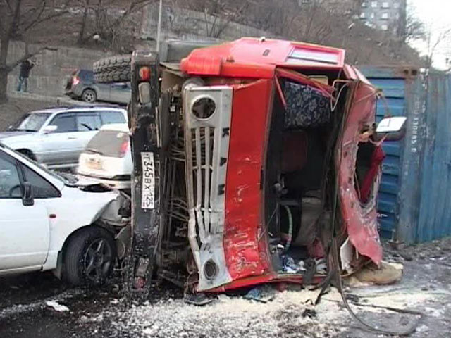 Во Владивостоке столкнулись сразу одиннадцать машин. Сначала КамАЗ врезался в два попутных автомобиля. Затем перевернулся, и, вылетев на встречную полосу, протаранил ещё восемь машин.