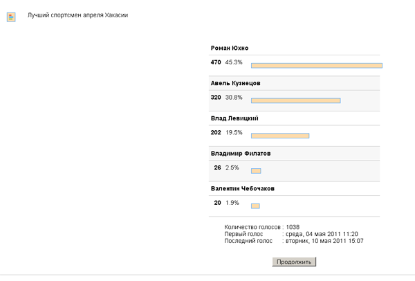 За своих номинантов проголосовало свыше одной тысячи человек. В итоге определились сразу три лидера. На первом месте пока находится юный черногорский спортсмен Роман Юхно (470 голосов). На второй строчке пловец из Саяногорска Авель Кузнецов (320 голосов). Еще один спортсмен из Саяногорска Влад Левицкий имеет в своем активе чуть более 200 сторонников.