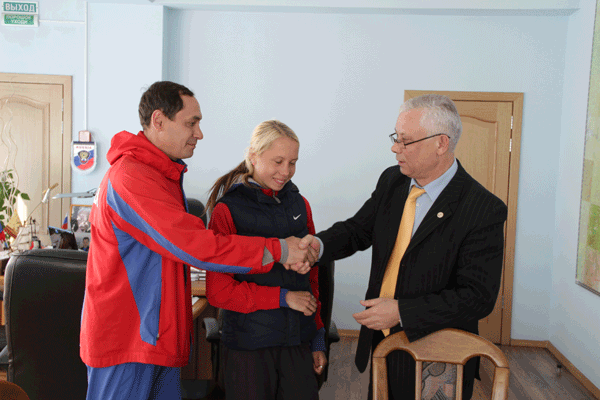 Во вторник, 17 мая, победительница первенства России по марафону, который проходил в минувшие выходные в Москве, Анастасия Зуева и ее тренер Андрей Ромащенко получили личные поздравления от министра спорта, туризма и молодежной политики РХ Валерия Денщикова.