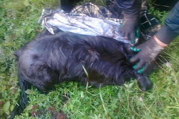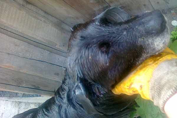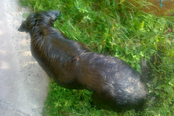 «Грэя выпустили на улицу около 9 часов утра. Около 13:00 муж заметил, что к дому подходит пес. Он даже не сразу узнал его, так как от битума шерсть его блестела. Было видно, что он не просто заляпался в битуме, а что его окунули с головой. Кроме того, к задней лапе была привязана веревка. В течение всего дня и вечера мы пытались отмыть Грэя соляркой и растительным маслом, но все безуспешно. Позже мы увидели, как он стал испражняться битумом», - сказала Надежда Эгоф.