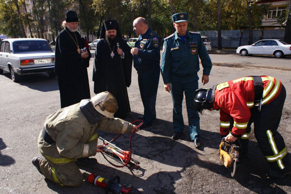 Официальное мероприятие началось совершенно неформально. Начальник ГУ МЧС России по Хакасии генерал-майор Андрей Фирсов встретил архиепископа Абаканского и Кызылского Ионафана на контрольно-пропускном пункте абаканской пожарной части № 1 и предложил познакомиться с территорией боевого подразделения. Генерал показал Владыке, как оснащены и как работают оперативные службы МЧС - дежурная смена Центра управления в кризисных ситуациях, подвижный пункт управления, опергруппа, диспетчерская «01». Пожарный караул продемонстрировал свою выучку, выехав из бокса по учебной тревоге буквально за 30 секунд. Архиепископ поблагодарил пожарных за их самоотверженный труд и пожелал помощи Божьей.
