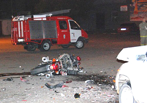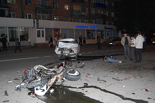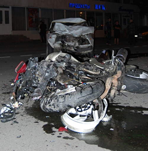 На скорости 155 км/час «Кавасаки» (проскочивший, по свидетельству очевидцев, на красный сигнал светофора) протаранил автомобиль ВАЗ, который поворачивал к кафе «Тайм-аут». От сильного удара машина и мотоцикл превратились в груду искореженного металла.
