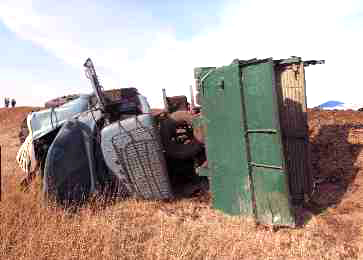 21-летний водитель "ВАЗа", двигаясь со стороны Красноярска в Абакан, не выдержал безопасную дистанцию с впереди идущим "ЗИЛом", доверху набитым навозом, и врезался в него. Удар был настолько сильным, что ЗИЛ съехал с дороги и перевернулся.