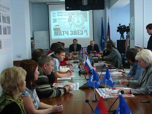 На пресс-конференции заслуженные игроки получили от Минспорттуризма Хакасии памятные подарки. В рамках своего визита в республику хоккеисты сегодня отправятся в Черногорск, где примут участие в закладке первого камня в фундамент будущего ледового дворца. А в 19:00 на стадионе «Саяны» в Абакане состоится легендарный матч.